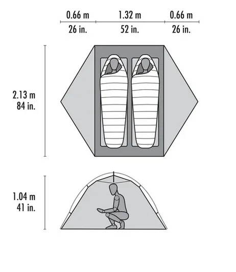 Skutečně obdélníkový půdorys a prostorný interiér bez problémů pojme moderní širokou karimatku; unikátní geometrie prutů zajišťuje výjimečnou výšku stropu (1,04 m).