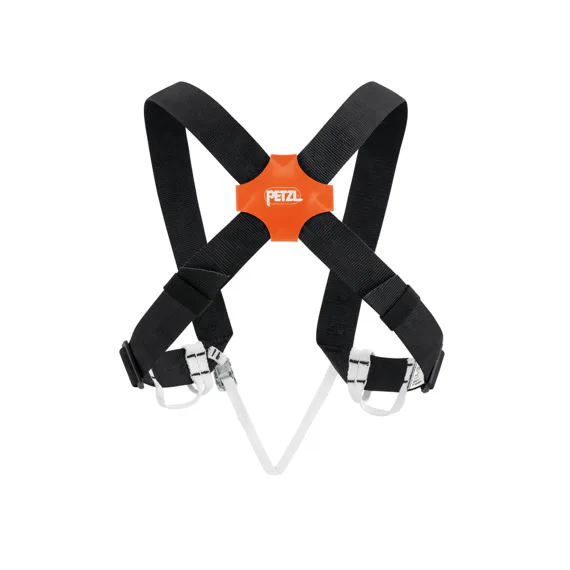 Ramenní popruhy pro polohování hrudního blokantu Croll při výstupech po laně ve speleologii, opatřené poutky na materiál.